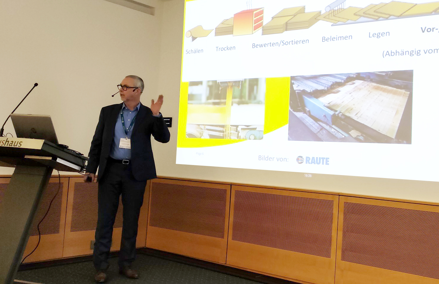 In der Session Holzbau wurden die Ergebnisse zweier Forschungsprojekte vorgestellt. Über den Einsatz von Lignin-Phenol-Formaldehyd-Klebstoff zur Herstellung von Furnierschichtholz berichtete Dr. Dirk Grunwald (Prefere Resins Holding GmbH). Dr. Tobias Robert (Fraunhofer WKI) gab Einblick in die Forschungsarbeiten zur Entwicklung biobasierter Haftklebstoffe (PSA) für Klebebandanwendungen sowie zur Synthese UV-härtender Haftklebstoffe auf Itaconsäure-Basis. Andreas Weber (IHD Dresden gGmbH) stellte die Ergebnisse des abgeschlossenen IGF-Projekts „Faba4Wood“ vor, das den Einsatz natürlicher Bindemittel auf Basis von Tannin-Protein-Komplexen aus der Ackerbohne zur Herstellung von Holzwerkstoffen, insbesondere Spanplatten und MDF, umfasst.